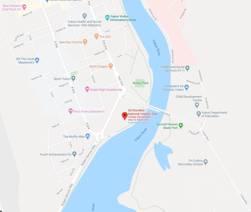 S.S. Klondike sits besides the Rotary Park on the southern end of downtown, at the intersection of 2nd Avenue and S Access Road. The Millennium Trail loop starts right behind the sternwheeler. It is within the walking distance from the Main Street. There is also ample parking space at this site.